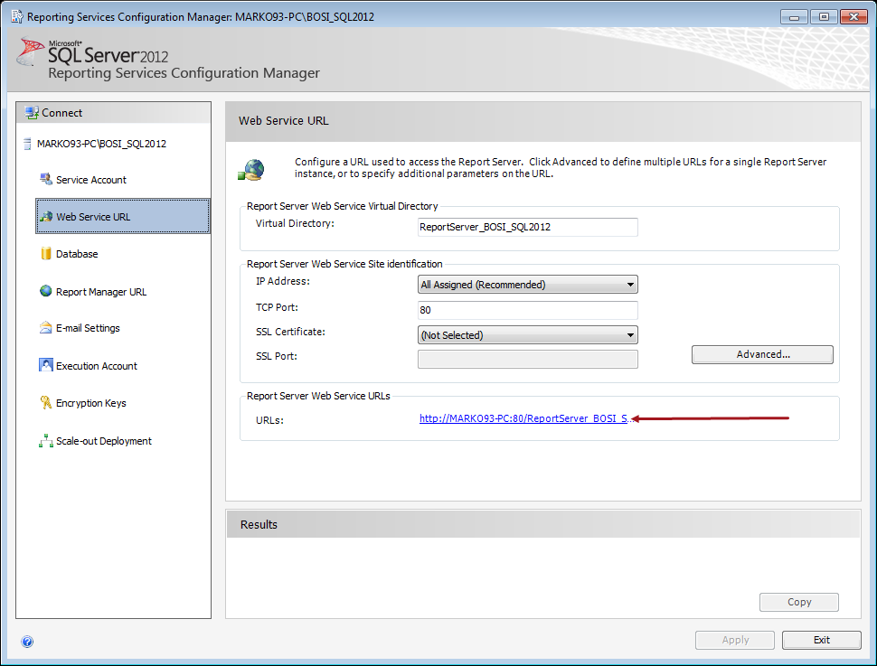 Final step in configure target server URL is to fill the Web Service URL in the TargerServerURL property with correct URL that you find in Report Manager URL.