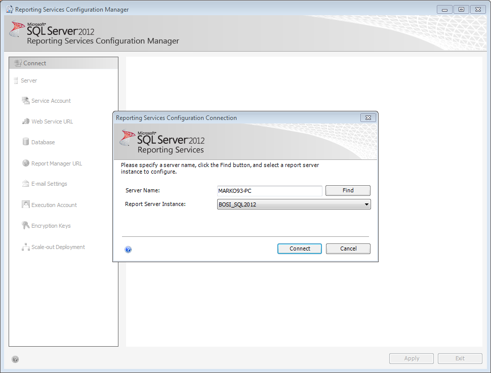 The first step that you need to do in configuration is to launch the SQL Server Reporting Service Configuration Manager and connect to the Reporting Service.
