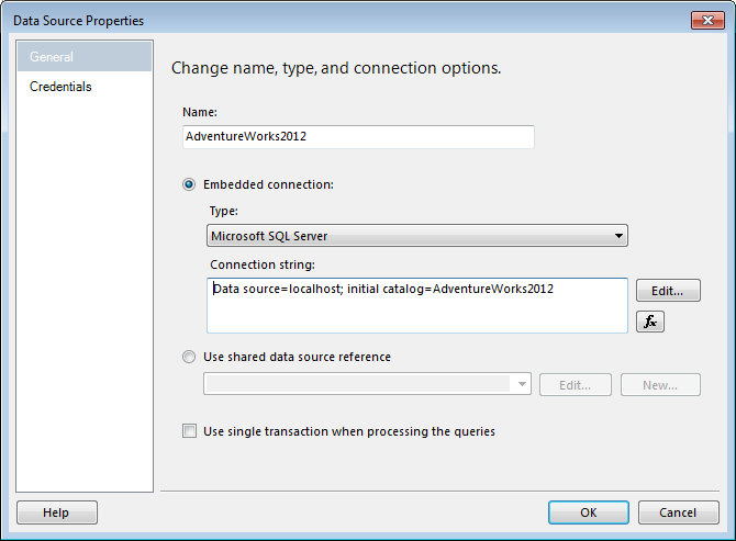 In order to retrieve data from a database or from some other resource, you will need to define the data source. In the following section, you will see how you can define the data source. We will use AdventureWorks2012 database as an example.